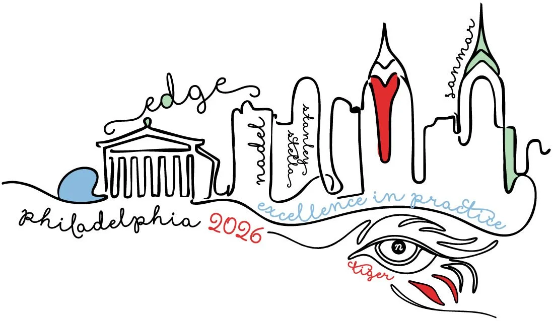 Vibrant splashes of color and text related to the event are layered throughout the illustration, injecting energy and movement into the otherwise monochromatic cityscape. These bold accents contrast with the precise lines, creating a modern look that feels both artistic and celebratory. The result is a dynamic visual identity for the event—one that captures the spirit of Philadelphia while presenting it through a fresh, modern lens.